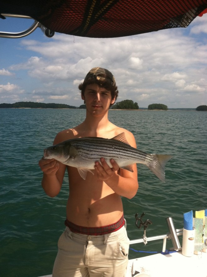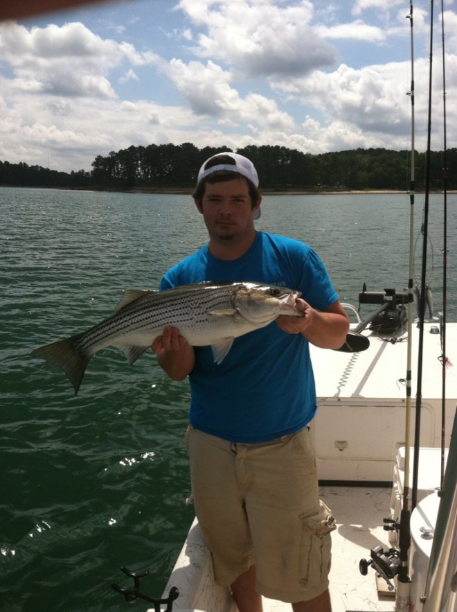 I’ve been winding down my trolling trips and doing a lot of work in the shop lately. I got out yesterday with Levi and Eric. Both guys help me around the shop and it was Eric’s Birthday so we took the afternoon off and hit the lake to see if we could get Eric a nice striper for his birthday. The water temps are starting to drop from all the cloud cover and shorted days. We saw plenty of fish both deep and shallow from 6 mile to the dam. We saw groups of smaller stripers up in shallower 35-40 ft water. We targeted a couple different shallower groups and we were able to get some smaller stripers by running the leadcore at 6-7 colors. We found some bigger fish on the south end and that’s where Eric’s biggest fish came from. It was a typical September pattern for trolling with lots of grouped up fish but not many takers on the leadcore. We didn’t have bait but I’m pretty sure we could have doubled the numbers with bait. It was a nice afternoon for trolling and I saw plenty of striper boats out and about. With a cool front on it’s way giving us cooler nights, I think the water may dip into the 70’s very soon. When that happens, I think we’ll see a little more topwater action both early and late in the day. Right now is a great time to get these Lanier stripers as soon well see the turnover and most of these fish will vanish for a period of time. There are a couple of fishing stories on my blog from fall and early winter that may help with the upcoming striper fishing season. Here’s a few pictures from yesterdays fishing.