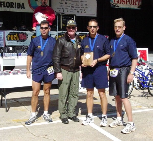 This was taken at my last marathon in 2004. This was a team Rob had put together with Rudy and I. I think we took first and this picture was myself, Rudy and Rob with the Commanding Officer of Pensacola presenting us with the award.