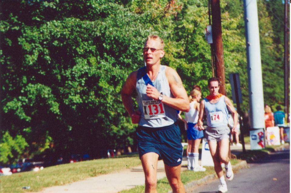 This picture was taken during the anchor leg of the 2000 Atlanta Track Clubs Ekiden Corporate Marathon Challenge. It was the first and last time I’d ever ran a team marathon event. I ran the final leg for team Southern Power. When I took over my leg, Home Depot was leading the challenge. At the end of my leg, I had passed the Home Depot runner and went on to win the race. One of the best races I’ve ever run. I timed my pace perfectly. The picture below is just before the finish line with the Home Depot runner in the background.