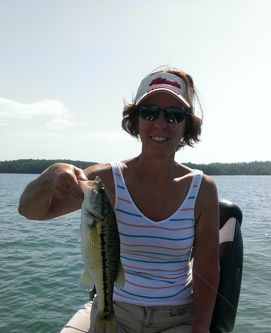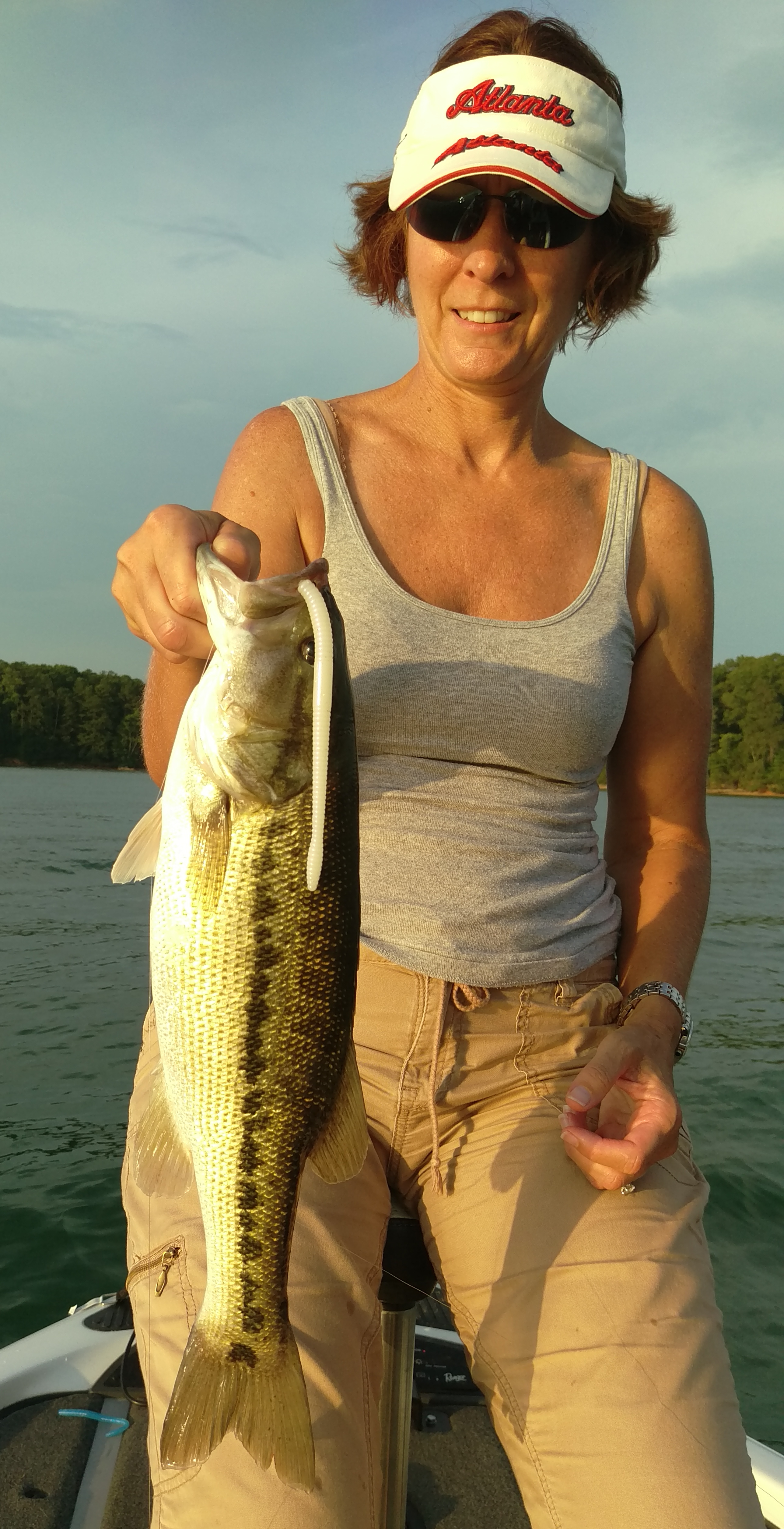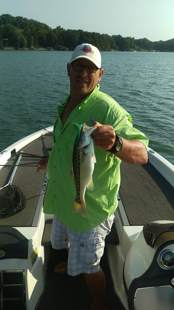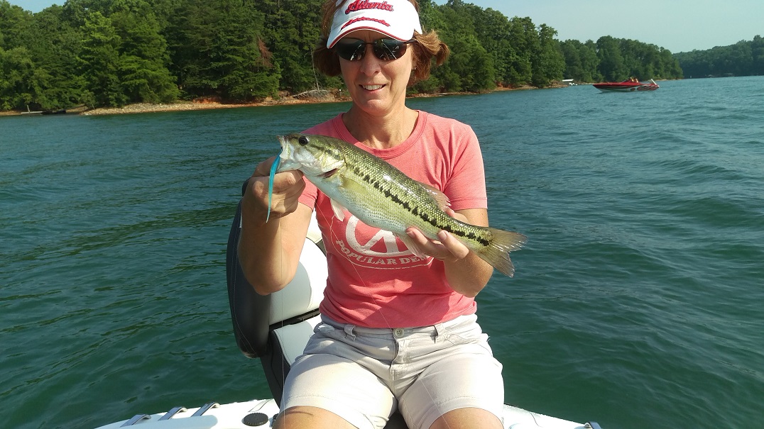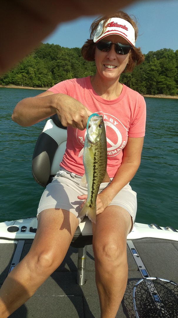 I‘m thinking…and hoping that we have reached the apex of summer heat this month. The topwater bite has slowed to a crawl due to the rising surface temps so we’ve been concentrating on the drop shot bite of late. The drop shot is a finesse tactic and is something we’re still learning but Lisa and I have been fortunate enough to find a few fish and we’ve had some good success with it this summer. I first started exploring the drop shot tactic for spotted bass on Lake Lanier years ago after reading a few local fishing reports from a fella that goes by the name of “Lanier Jim”. There’s no doubt that he’s the best on Lanier at catching spotted bass in the summer months on the drop shot rig and after reading his reports and seeing some of his pictures I was intrigued.