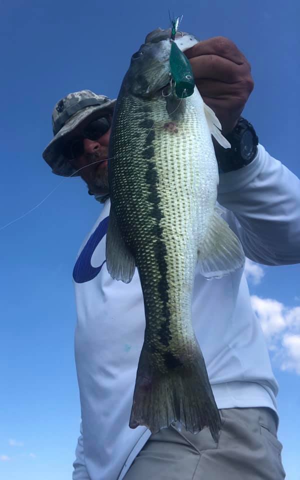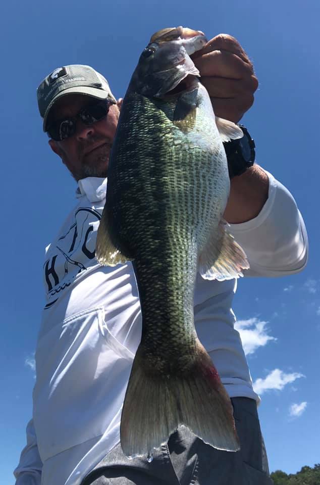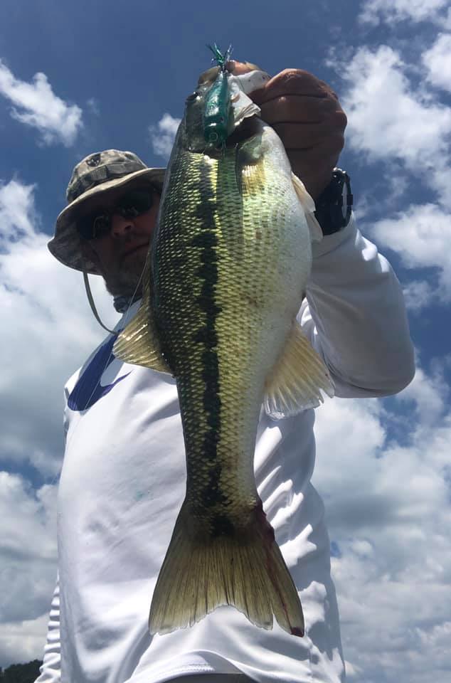 This week was a little different for me and for a few reasons. This time of year I would be doing a lot more spybait and drop shot but this week I wanted to see if I could get a 5+ pounder for a replica wall mount. I want to do it on the popper so that makes it a bit harder. I know there are bigger profile baits out there right now that I could use and more than likely get the job done rather quickly but I want to do it on something I created so that makes it a bit tougher. I’ve mainly been fishing the main lake because of the water clarity and the boat traffic in the creek but I also know my chances of a 5+ go way up out on the main lake right now. My strategy has been to fish the places I could throw the popper where there wasn’t too much wind. A light chop is perfect so I just looked for points and humps that either had no wind or just a little wind on them. When I start throwing the popper around a moderate to larger chop my hookup percentages go way down and it get’s much harder for the fish to pick up on it. This week I’ve had a pretty solid milk run and went up the west side of the main lake to past Vanns, hit the humps on the main lake and worked my way back down the east side of the main lake. I’m mainly fishing places to I have caught big fish in the past and my electronics doesn’t play a real large part of my fishing.