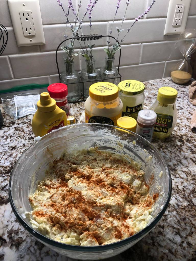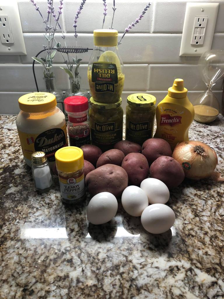 *All of these ingredients and the amounts are subject to your own taste so by all means make adjustments, additions or subtractions to make it to your own liking. This is just a basic potato salad recipe that I created while I lived in New Orleans. I needed a good side dish for fried fish.