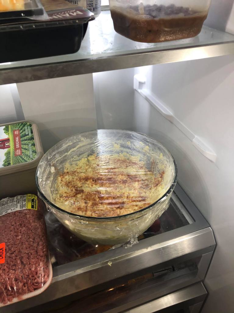 2. I like to hand cut my potato’s into pieces and chop the egg as well while they are still warm. Some folks like to use a potato masher but I like my potato salad with chunks. After chopping the potato’s and eggs I add the chopped onion and I place them in a big glass mixing bowl and place them in the refrigerator for at least an hour to cool and solidify the potato pieces. *This helps hold the potato’s together when you fold in the rest of the ingredients.