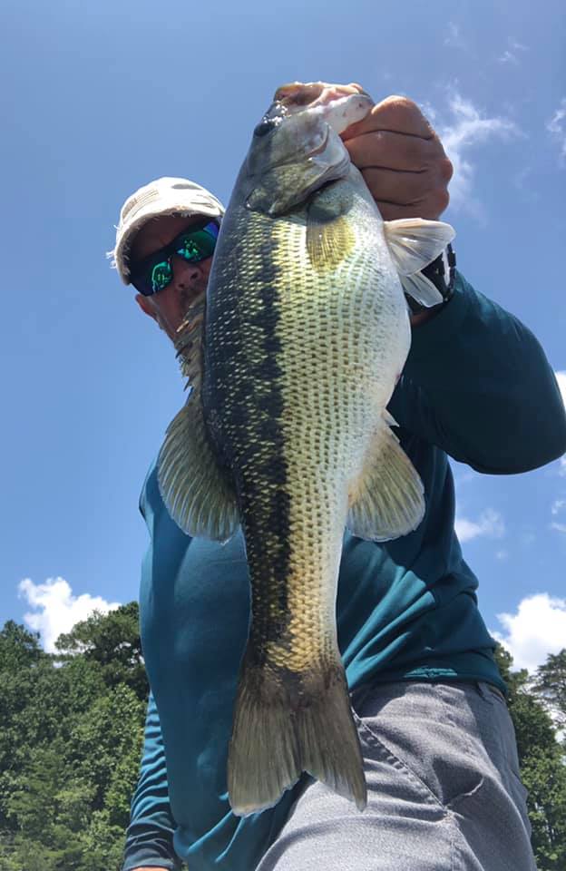 It’s typical summertime on Lanier and it’s just about like any other summer right now, the thermocline is setting up and the topwater is starting to dwindle as the oxygen levels decrease near the surface. I’m still seeing some big schools of bluebacks being pushed to the surface and this will probably continue as the fish know that the bluebacks are a slower target when the surface temps warm. The problem with that scenario is that there will be very little oxygen at the surface so the bass and stripers won’t stay up on the surface long and the bluebacks tend to go a little deeper in the water column as the summer progresses. If I was in the right place at the right time this week I could make a cast with my popper or the Ima skimmer and pick off a nice bass when they were schooling near the surface. That’s why I always recommend having your topwater handy because time is critical when these fish surface chasing bluebacks. I pretty much made a morning out of running and gunning with the popper this week but I am mixing in more and more spybait and drop shot on every trip. If the topwater bite continues to slow I’ll just focus more on making good casts with the spybait and spending more time with the drop shot. I’m mainly concentrating on the main lake early in the morning and coming back into the creek midday to fish the brush piles in the creek on the way home. It seems like the fish in the creek are on a different feeding schedule from the fish out on the main lake this week. The big fish on the main lake points and humps are up early and chasing bluebacks on or near the surface and the big fish in the creek don’t get going till mid to late morning. If I was lucky this week I could find areas on the main lake where there was a little chop on the surface which was just enough distortion to fool a bass or a group of bass. If there wasn’t any wind and the surface was flat I would generally pick up the spybait and start fan casting areas around brush and over the crown of humps on the main lake. Bringing the spybait over the top of a brush pile accounted for a few of my nice fish this week but also I would bring the spybait across the crown of humps both out on the main lake and in the creek for a few good fish. Sometime while I was fishing an area the surface would go from flat to a little chop and I’ll pull out the popper and work the popper down wind and bring it back up wind and against the grain. If I’m using the popper at least 75% of the time I’m bringing it back up wind to create more surface disruption and attention. If an area goes flat while I’m using topwater, generally I’ll switch to the spybait and start fan casting. Spybaits come in all shapes and sizes now so you just need to pick out one that catches your eye and give it a shot.