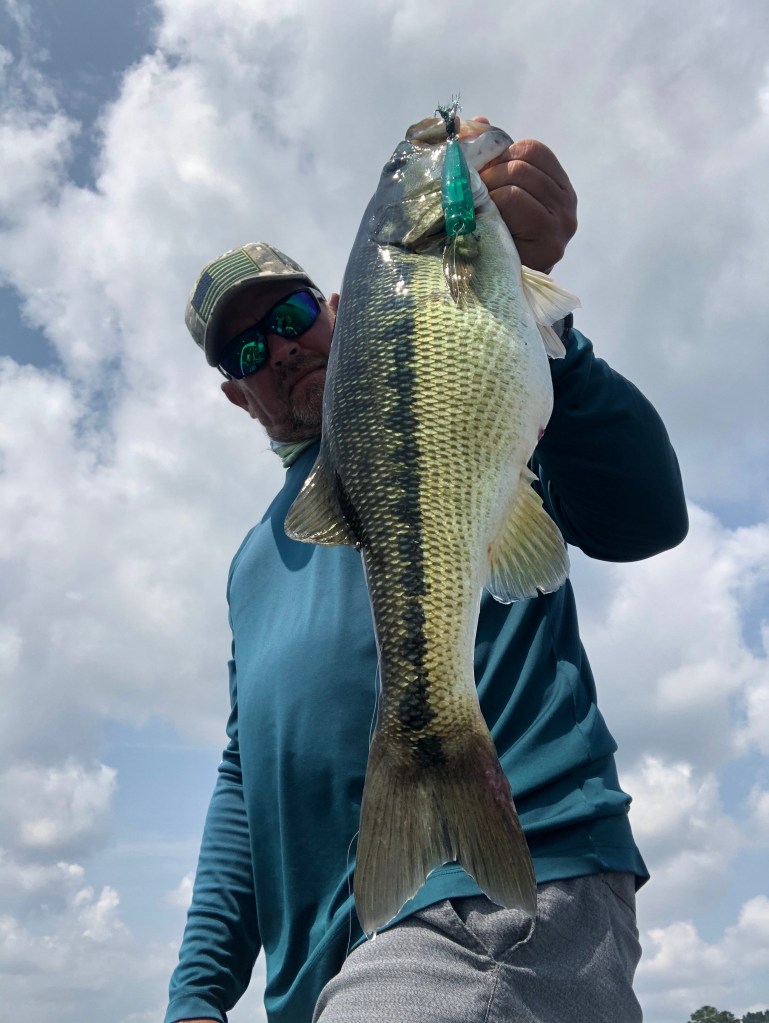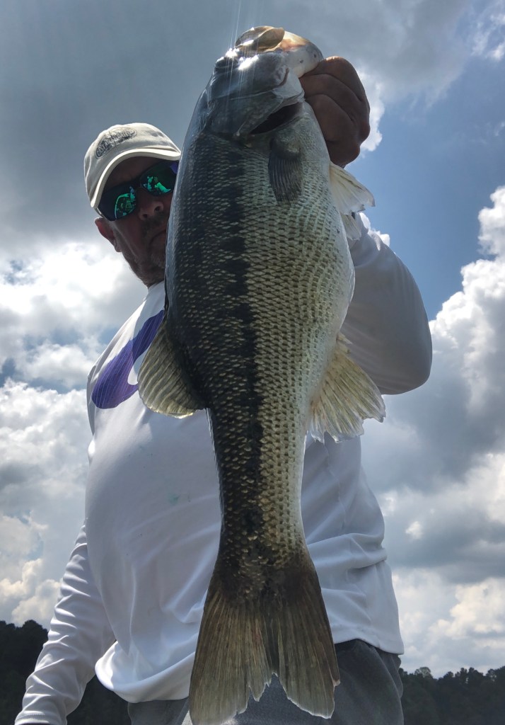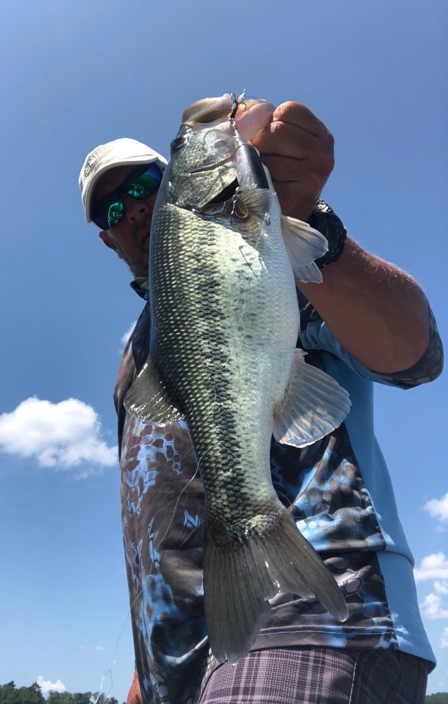 I had a few fish over 4lbs this week and some of the explosions were magnificent! These fish are pushing bluebacks around all afternoon on the big water and in the creek. If you find the areas where the bass are chasing bluebacks like points and humps, there are a few different ways to catch these fish but I’m just running and gunning in the hot sun, not spending more than 10-15 minutes in one place and then moving on. I’m covering my skin and keeping hydrated in the hot afternoon sun and moving around frequently usually cools me down if I start getting hot. I’m guessing water temps are in the upper 80’s and the lake is just below full pool and dropping. The corps is generating in the hottest part of the day and what little wind we had the week was out of the west. Here’s a few pictures of my memorable fish this week and I also included a link to my “On the Cast Away Deck” video with some cast to catch footage this week.