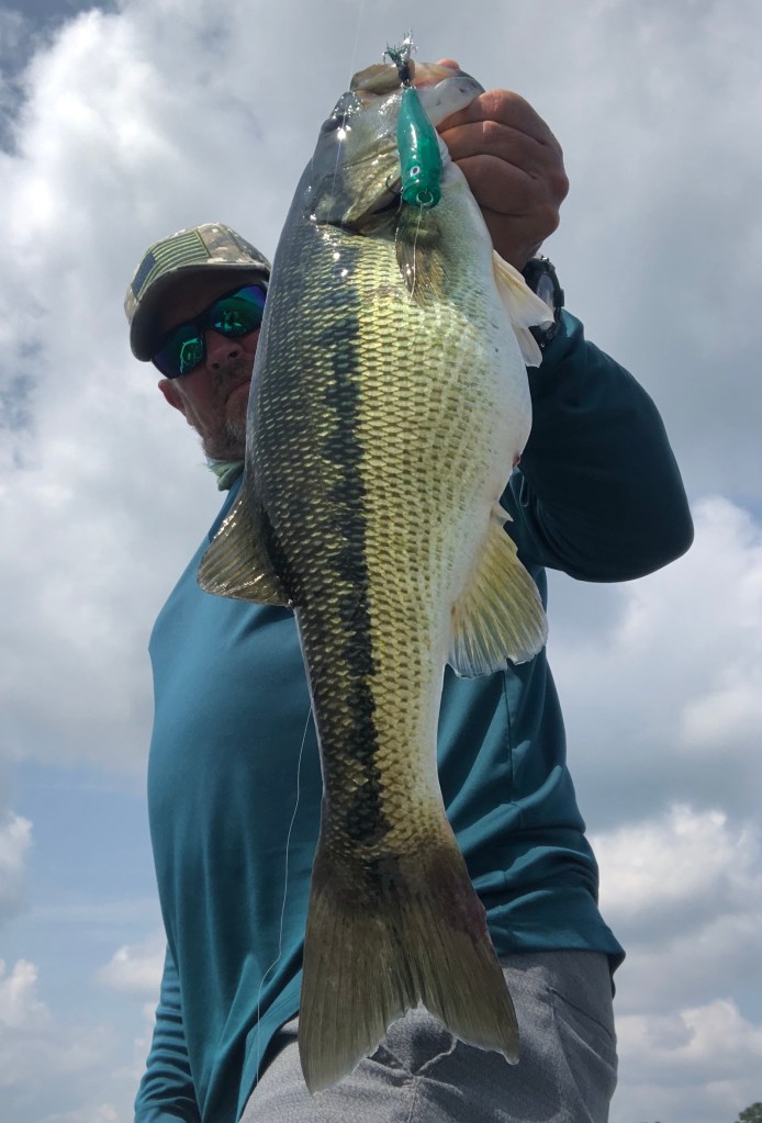 The week started with temps in the upper 80’s to low 90’s and the wind was light and variable but you could find patches of little choppy water from small random breezes on the water and if one of those little choppy areas just happen to be over a point or hump it was game on for me. Basically, when I left the creek in the morning my eyes were on full scan across the lake looking for the choppy areas over the points or humps I could fish. If I saw a place that looked good I would set the boat just upwind of the point and I’d make casts down wind with the topwater bait. That was the primary objective but if I had to fish into the wind I was probably going to use the Grande Ima because that thing casts a mile like a bullet into the wind and works well bringing it back down wind. If I fished down wind the popper was my primary bait from Monday till Wednesday and then the popper bite just died. I used the Ima a good bit after the popper bite died on Wednesday but the problem with the Ima is that the fish are seeing it a lot now and they aren’t totally committed to the bait so I was getting a lot of short strikes and near misses. It was getting frustrating to make all those casts with a bunch of blow ups but no fish to show for it. On Thursday I decided to put my custom whopper plopper back into the mix to throw the fish a curve ball. They had been on a steady diet of walking baits and popping baits but I hadn’t hit them with the whopper plopper since April so I put it to work in the same areas I was using the other baits. To my surprise, on the first cast with the little custom 110, I caught a decent fish and followed it up with fish after fish. The bite only got better as the day progressed and on Thursday afternoon it was blazing hot but the fish were responding to the plopper very well. I didn’t need another bait and lost count of the fish I was catching. I started shaking as many smaller fish off as I could, only landing the bigger fish if possible. The big question on Thursday evening was whether or not it would work on Friday. That was answered in short order yesterday as I picked right back up where I left off with the whopper plopper, they killed it yesterday too.