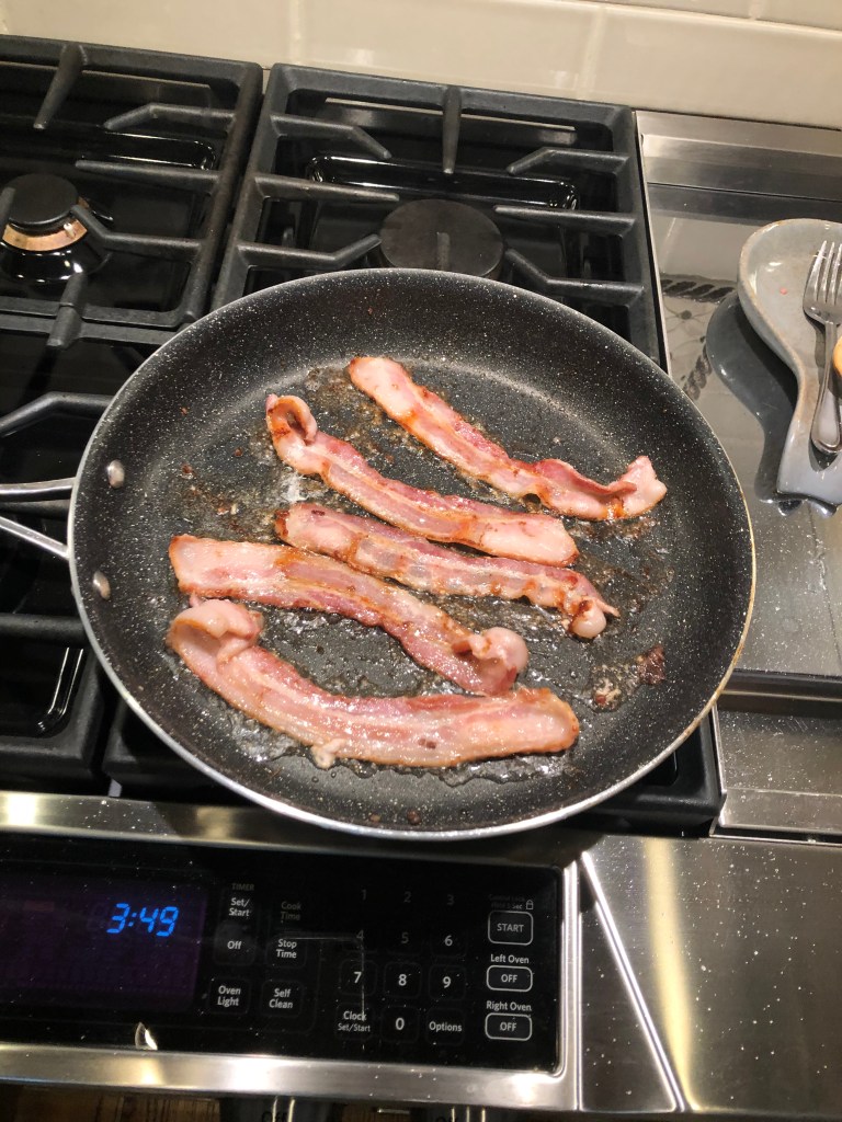 When everything is mixed thoroughly, top with the stripes bacon and bake the mixture uncover at 350 degrees for 45 minutes. Ready to serve.