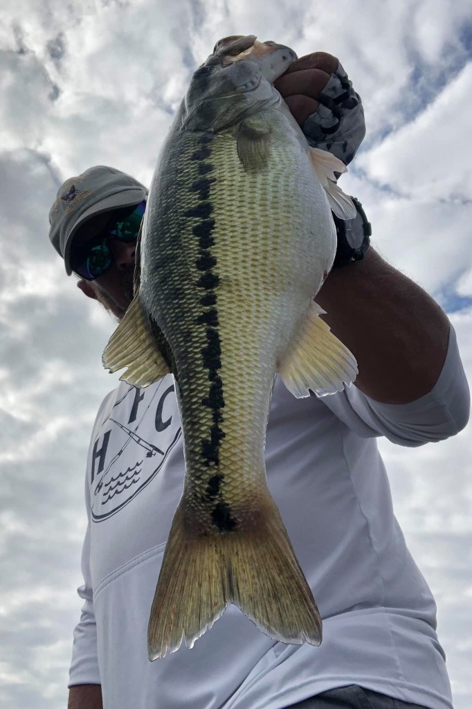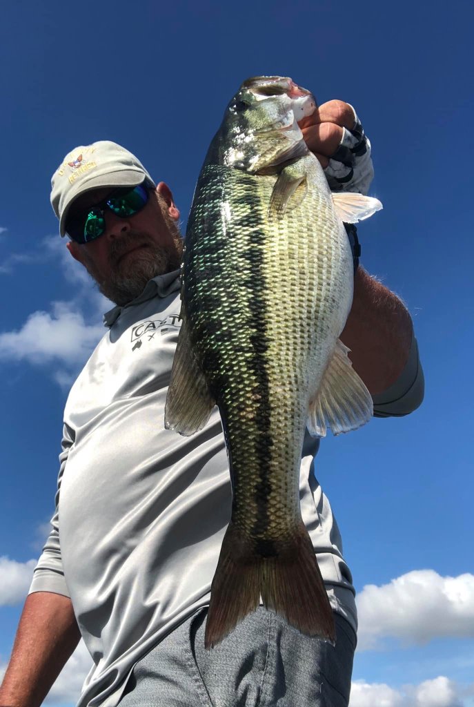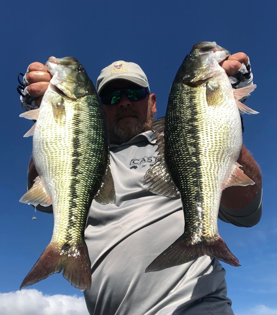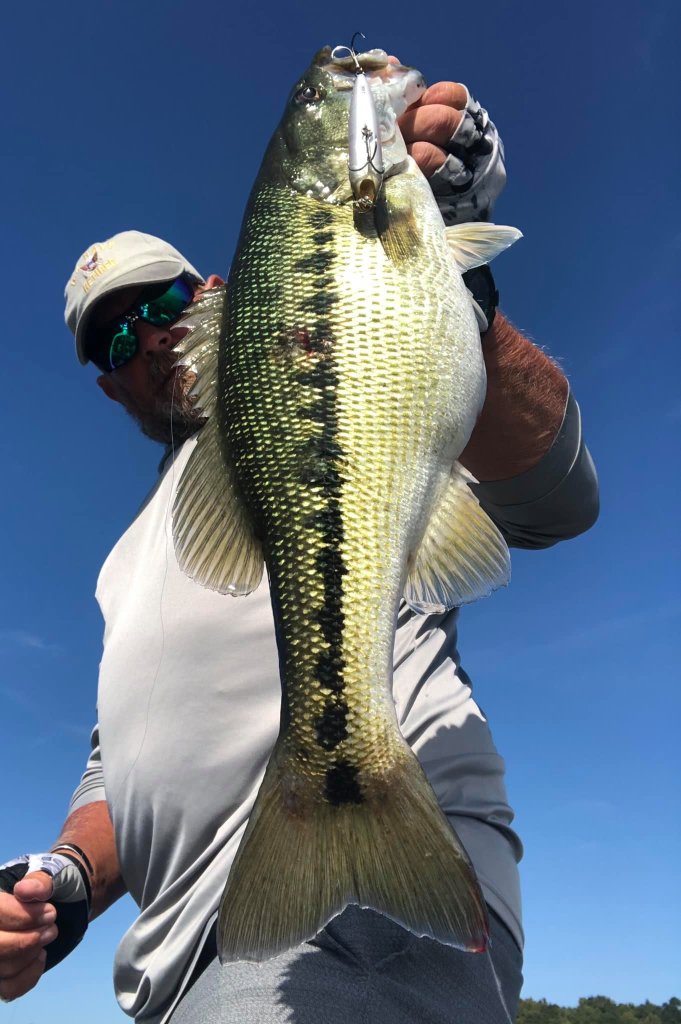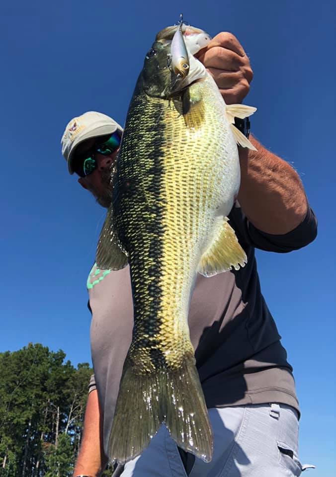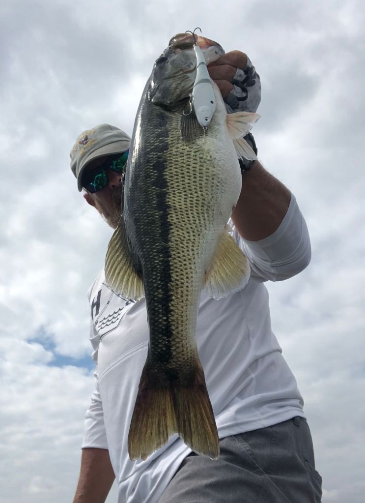 This week I started my mornings offshore in search of a few things that needed to come together to make the topwater bite work for me. I would leave the creek about 8am and look for the areas of choppy water out on the vast main lake. Luckily, I was blessed with the ability to see well at a distance in my later years so I’ve been able to find the choppy areas for a great distance on the waters surface. It seemed like every morning there were these random areas of choppy water where there were areas of breezes across the lake. When these random breezes and patches of choppy water would collide with offshore humps or points with brush, that’s the areas I was targeting. If it was a hump or point and it had chop on it I would fish it because the chop seemed to distort the fishes view of the bait and they were more apt to commit to the bait rather than just swipe at it or ignore it. These patches of chop or random breezes would just drift around the lake in different areas in the mornings so I would just jump from one spot to the next following the breeze. The only 2 baits I threw this week was a custom painted pearl white Sebile and the Azuma Z Dog walking bait made by Profound Outdoors. It’s really all I needed to catch some nice beefy fish. I didn’t score big numbers but I did score some big fish. Here’s a picture of the 2 baits I used this week.