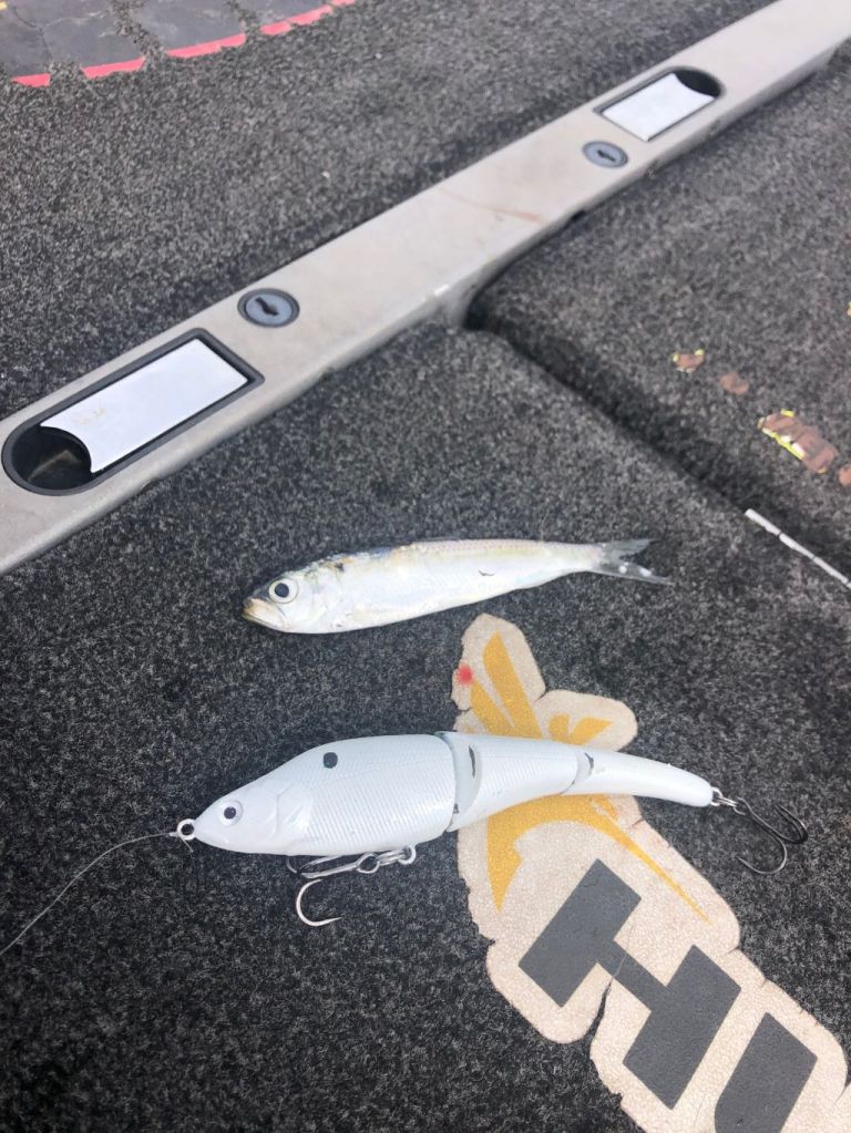 The other bait I used this week was the pearl white Sebile. I sanded down a couple of 125 slow sinking Sebile’s I had lying around and repainted them my pearl white color pattern. This is a pattern I’ve used in the fall for a few years now and it has been money for me on overcast days and low light. This week I used it early in the morning out on the offshore stuff while the fish were actively schooling and I could make a cast to them. My Sebile was just about as deadly as the Z Dog with the fish chasing bluebacks on the surface. Here’s a picture and a video from Tuesday with a nice offshore bass on the custom painted Sebile. We had some good cloud cover Tuesday morning and it was a perfect time to use the custom Sebile. The bass in the first picture below spit up the blueback in the second picture and a video of catching the fish below.