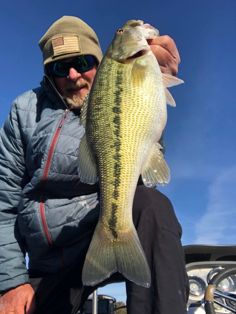 This week was pretty typical for an early winter warming trend, and I played it perfectly. The west wind we saw all week followed by very warm temps brought some good fish to the bank. This time of year, a small population of bass will migrate to the shore for one of two reasons: first being rises in the water level will put fish on the bank in search of a meal in new submerged shoreline and the second reason they come to the bank is for the warmth of the sun.