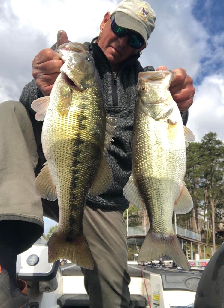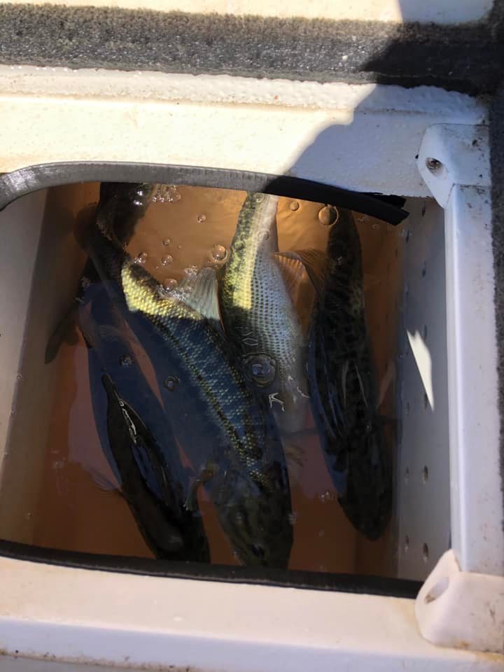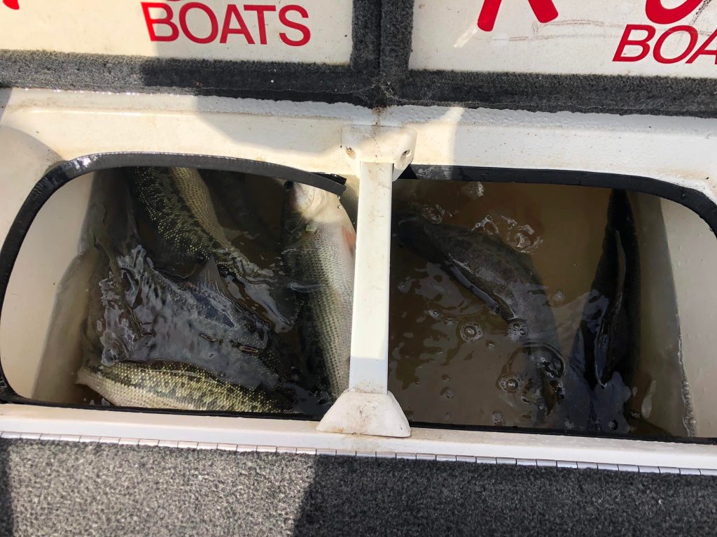 This week I fished Monday, Wednesday, yesterday and today with pretty good results for numbers using the little Lanier Baits 1/4-ounce Damiki with a 3-3 swimbait from KBDBaits for the first few hours of the morning, and then moving to the rocks and docks with the shaky head or ned rig in the afternoons. On Monday we had a west wind and after a visit to the magic ledge and a couple of ditches in the creek I had 3 limits of fish so far. I set out for YD again, knowing that there would be wind on an area of rocks and docks that I wanted to visit. By the time I got there, the wind had kicked up a pretty good chop on the water and one dock in particular was right in the wind. The dock had a shade patch on the north side, and I made a cast into the patch with my shaky head but before the worm hit the bottom, I had my first fish from the dock. I pulled out a little further and hit spot lock in the wind and cast to the shade patch again, and again I caught another fish. This happened 5 times within a shade patch the size of a small car, in the wind a waves. It was a pretty cool way to end my day in the early afternoon. No big girls but fun numbers. Here’s a few pics from Monday.