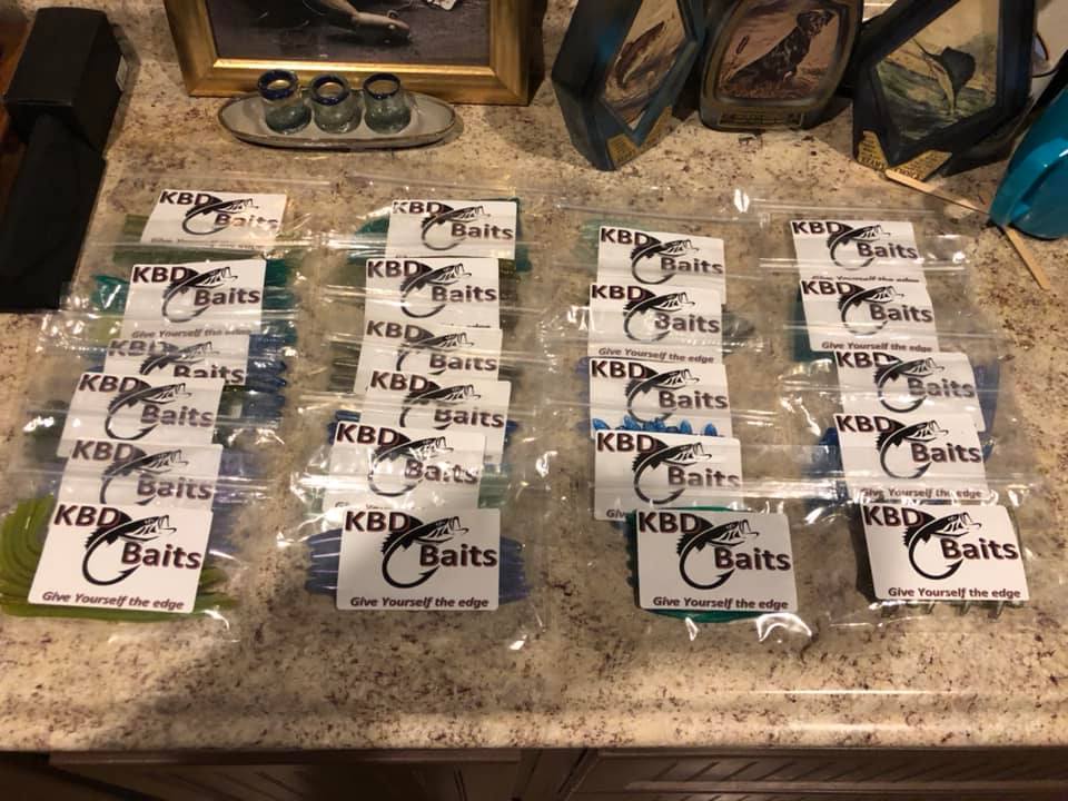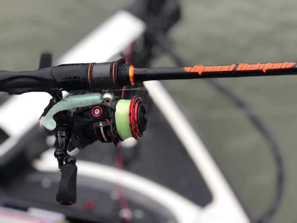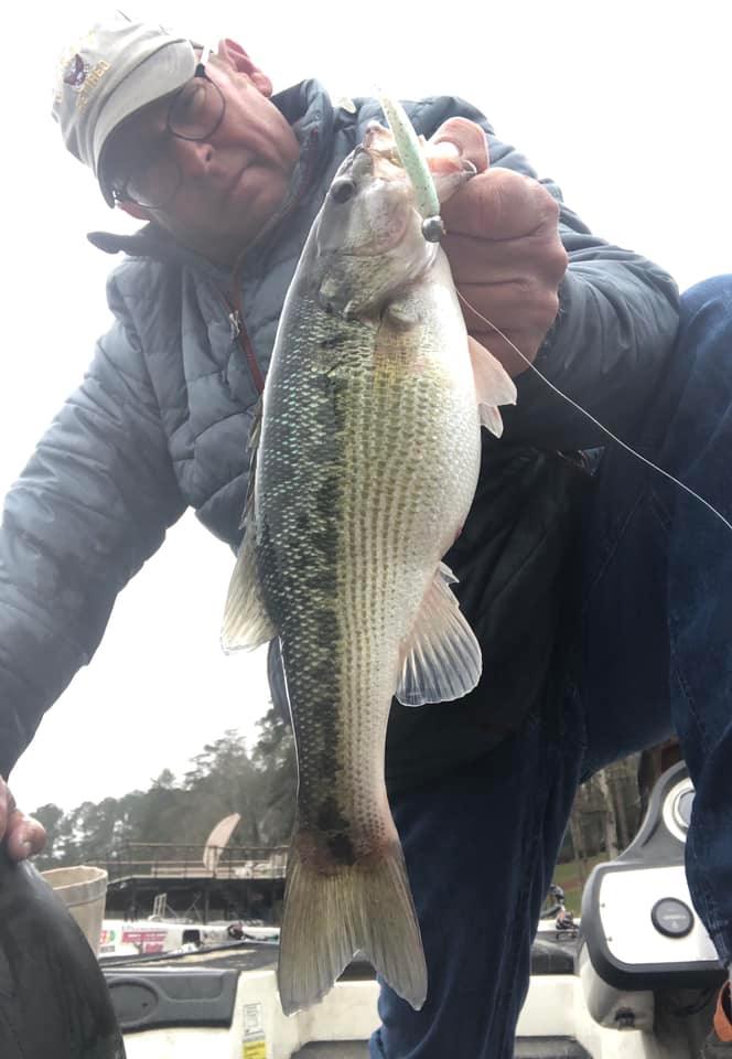 A strong cold front came through overnight and I really hadn’t planned to fish today but I finished some baits and had a couple hours to burn so I hit the lake not expecting much, but to my surprise the fish were biting pretty well with the strong north winds. The first stop I made was to the magic ledge, but it was after 12 noon and the ledge bite usually dies off about 10 or so but I made a couple casts with a new little swimbait color. Here’s a picture of the little swimbait on a Lanier Baits Damiki head I chose today. Kevin, from KBDBaits told me the color was called “green gizzard”.