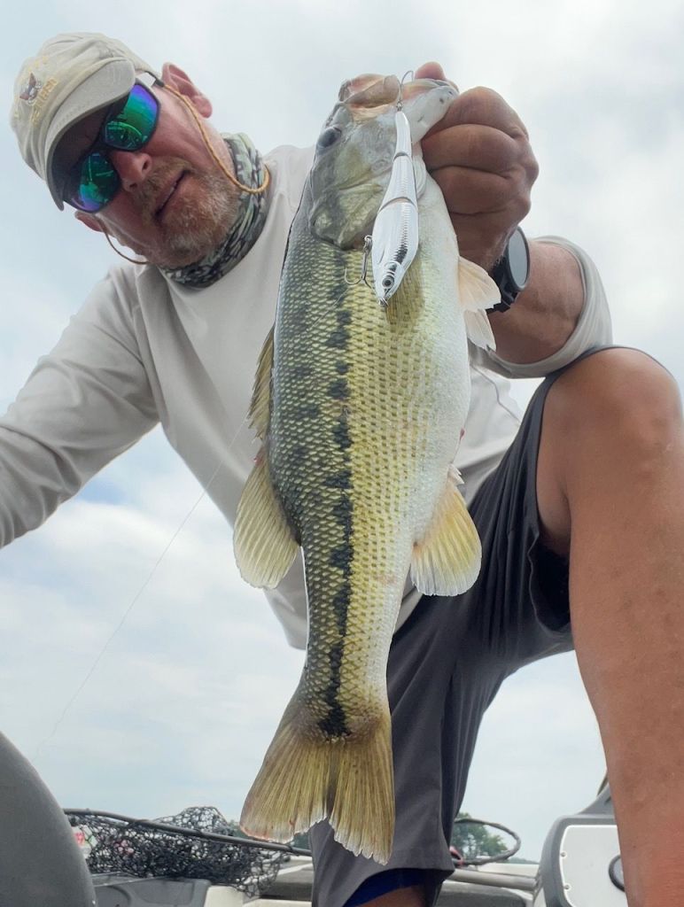 On Wednesday I got out for the morning with my neighbor David, and we focused on the topwater and ended up with 12 fish for the morning. We had a decent Choppo bite, and we had a little wind to work with, so David used a pearl white 105 Choppo and I had a 105 in a ghost pattern. I think we were about even in the number of fish we caught and that pearl Choppo was the ticket early in the morning while it was still a little low light. After the sun came up, mid-morning the ghost pattern started producing better. The pattern for the bait was back to slow rolling it. Ripping the Choppo wasn’t necessary to get bit, it was just a cast, a few quick pulls to draw attention and then slow rolling it back to the boat. The technique would usually gather a school of bass and it would get hammered by the school. We had some good explosions but the topwater really slowed down about late morning. I dropped David off at his dock around lunchtime and I went back out to see if there was a better afternoon spybait bite and drop shot bite. Here’s a few pictures from our morning and some of David’s pearl Choppo fish.