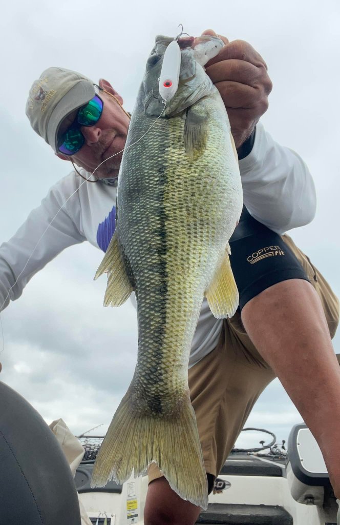 The other way the bigger spotted bass hit my little spybait is what I call the “brick”. I call it that because when they hit the spybait it feels like the spybait just hit a brick. It’s a dead stop for a split second and then the fish goes into the routine. It’s like those big old bulls in the PBR rodeo. All of the bulls have their own little moves coming out of the chute. Some come out spinning and some come out bucking. The spotted bass has some moves too and in the case of this morning on that main lake hump, I hit a brick with some moves. The bass did what just about every big bass does, it headed straight back down towards the brush he came out of and as soon as I saw the trajectory of the line start moving downward, I knew it was a big one. That’s when I raise my rod tip to try and turn the fishes head up instead of down. If I’m successful in keeping the big fish out of the brush with a good setting on the drag, the fish usually comes shooting straight up to dislodge the bait and try and shake it while jumping out of the water. They may go through this routine a couple of times but this morning it didn’t work, and I managed this 4.14 pictured below to end my week.