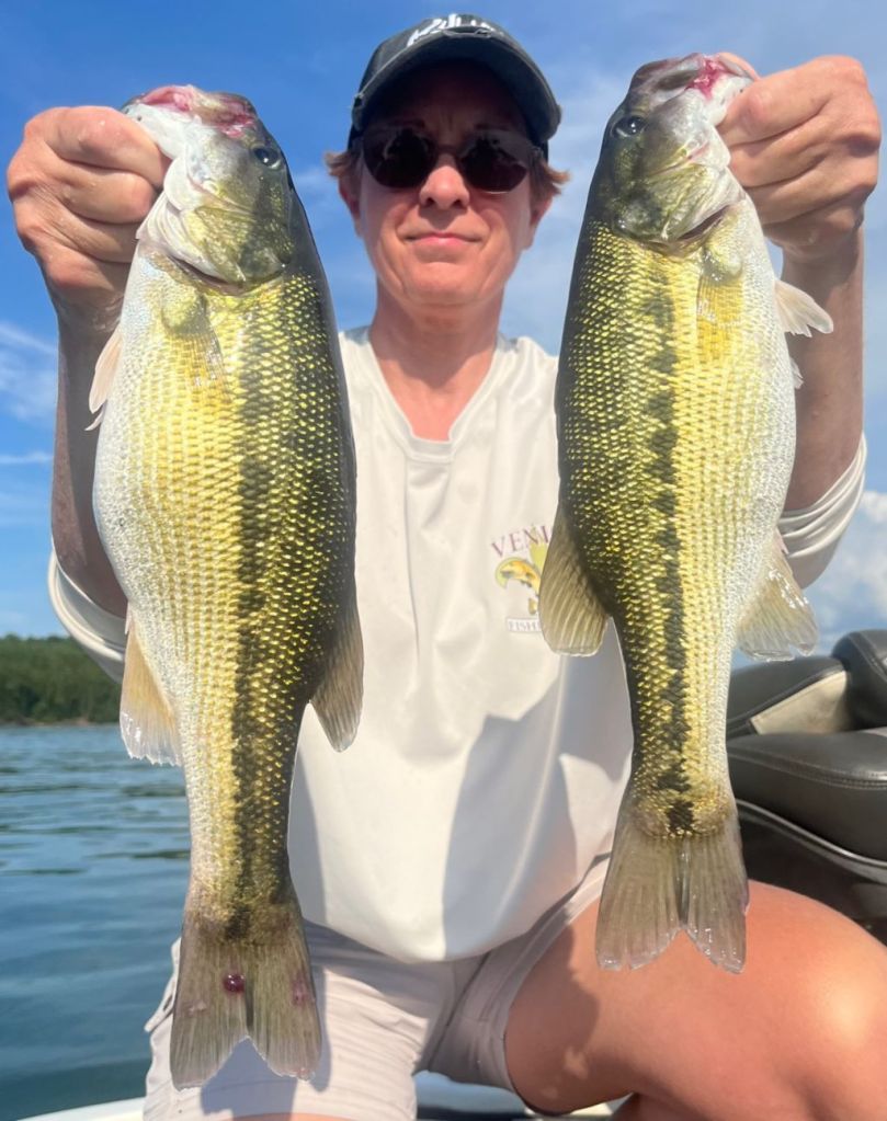 Tuesday, I worked down in the man cave during the day and Lisa and I made a quick evening trip for some spybait/drop shot action. It was slow and boat traffic was heavy in the creek, but we managed a few on both drop shot and spybait. Here’s a couple of nice spybait fish that Lisa caught Tuesday evening.