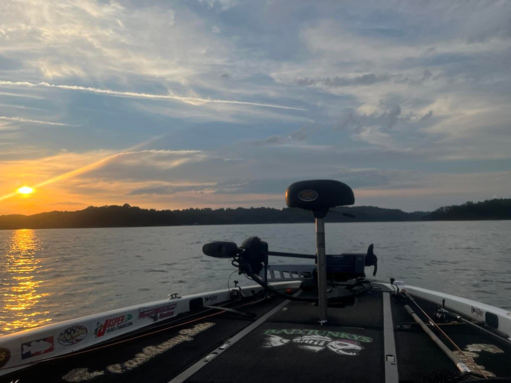 This week I picked up where I left off last Friday. The spybait, spoon and topwater was the deal. I was kind of excited about this week getting because of the cooler temps and the prospects of a better topwater bite. On Monday I started out with the topwater and spybait option with just a little flutter spoon thrown in. I was seeing more surface activity than usual and the more I saw on the surface the more I wanted to throw topwater. I cruised out to the main lake very early, found a nice breeze, a moderate chop as well as this late summer sunrise pictured above.