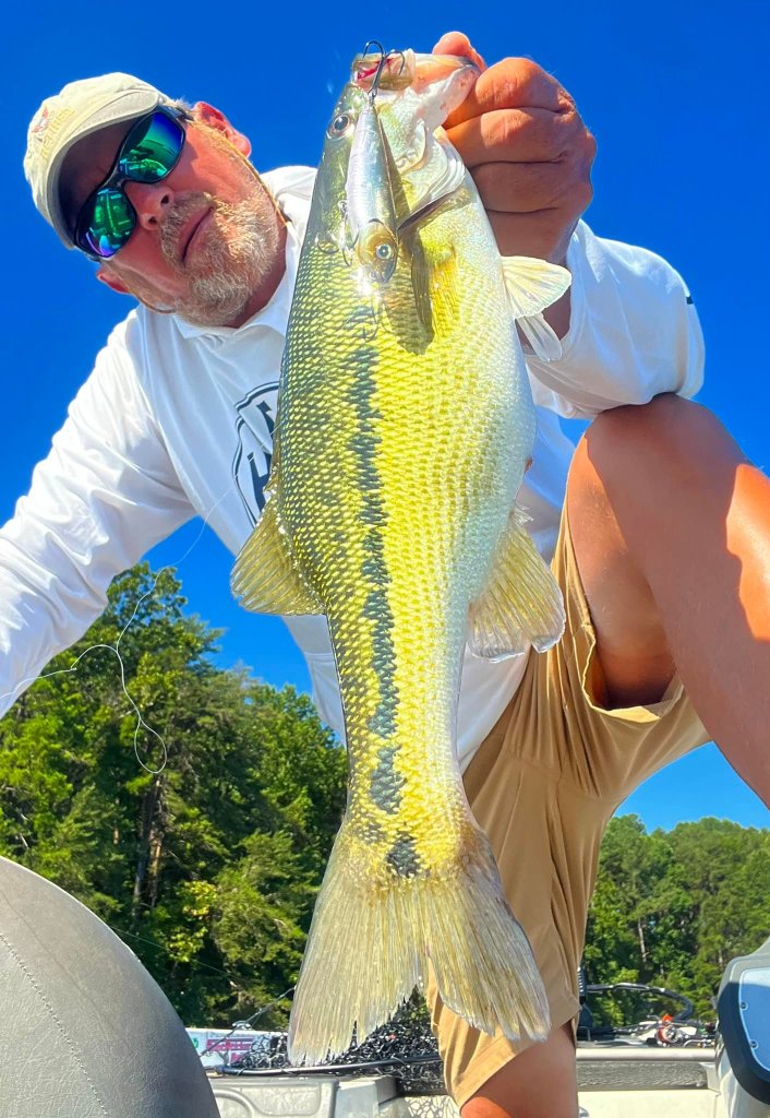 On Thursday morning Jeff Nail jumped in the boat with me and we found a few schoolers here and there. I mainly threw the topwater stuff and Jeff was throwing a Jerk shad from Lanier baits or the Trixster Baits 4.25 in Tricky Shad. I think we had 6 fish total and most were caught on the jerk shad while I had 1 topwater fish on an Azuma Casper Shad walking bait. Here’s a nice fish that Jeff caught on a Jerk Shad on a hump we were fishing.