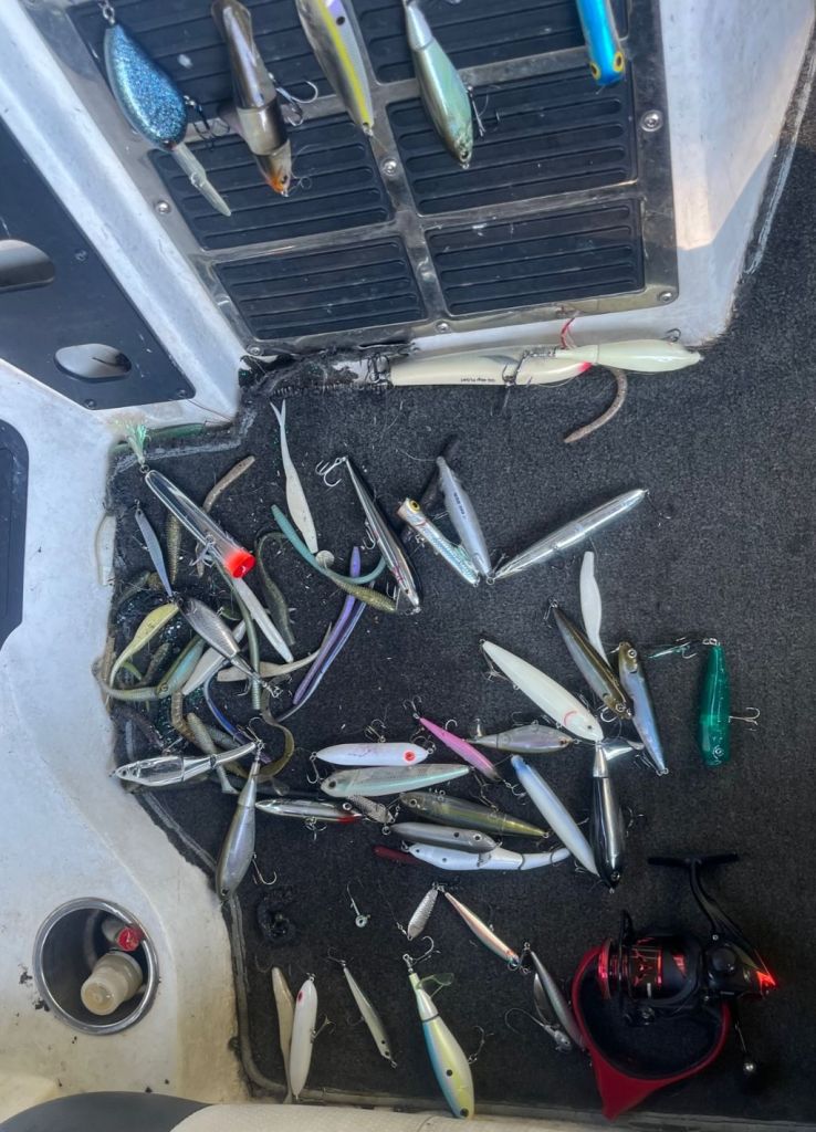 The thing about the topwater is that it gets better as the day progresses. Reason being is that the bluebacks get closer to the surface as the sun gets higher. The fish know this, and they usually don’t start focusing on the surface and cruising for bluebacks till the sun gets high in the sky and the warmest part of the day. Around noon I was over in another creek and a striper tore off with my little z-dog and when I tightened my drag a bit to keep him out of the trees the line broke and my z-dog was gone. I waited a few minutes in the area but the fish never shook the z-dog out. Now I was bummed but I remember a buddy telling me that he had caught a few good ones on a little chug bug the week before and so I looked down at my gut pile and found a little chugger, one of my favorites for this time of year. By the way, here’s a picture of my gut pile right now and the brunt of my friends jokes about the cleanliness of my boat. You can see a little chug bug in the pile, and I tied it on.