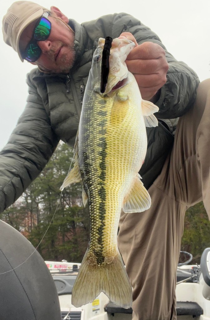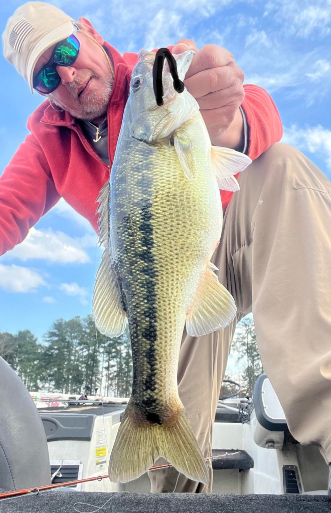 This week was hit or miss with the staging bass, but the rocks and docks was all I focused on with one bait, the shaky head. I know that I’ve got the worm color blacked out this week because the worm color doesn’t really matter, and you may have better success with your own color than trying to use mine. I used two different colors this week and both worked well. When it gets to be staging time on Lanier, the bass are going to eat, and they aren’t very selective about what they eat. I caught a couple bass this week that were regurgitating chow on their way to the boat and what they were barfing up was a cornucopia of chewed up mess. There were chucks of crawfish, frog legs, dead brim, shad, bluebacks, bugs and I actually think I saw an old chartreuse Hot Wheels car as well! The point is that these fish are feeding on a lot of stuff, so color choice doesn’t really matter, and bait may not matter as well. I ran into my lake neighbor yesterday on the lake and we chatted for a while. While we were chatting about our week, I couldn’t help but notice the worm he was using. It was very bright in color, and he had shortened it a bit. His little worm stood out like a sore thumb, and I asked him how his little worm was working. He said, “Jim, I’m smoking them with this little guy”. They were on that little unique worm like a bum on a ham sandwich.