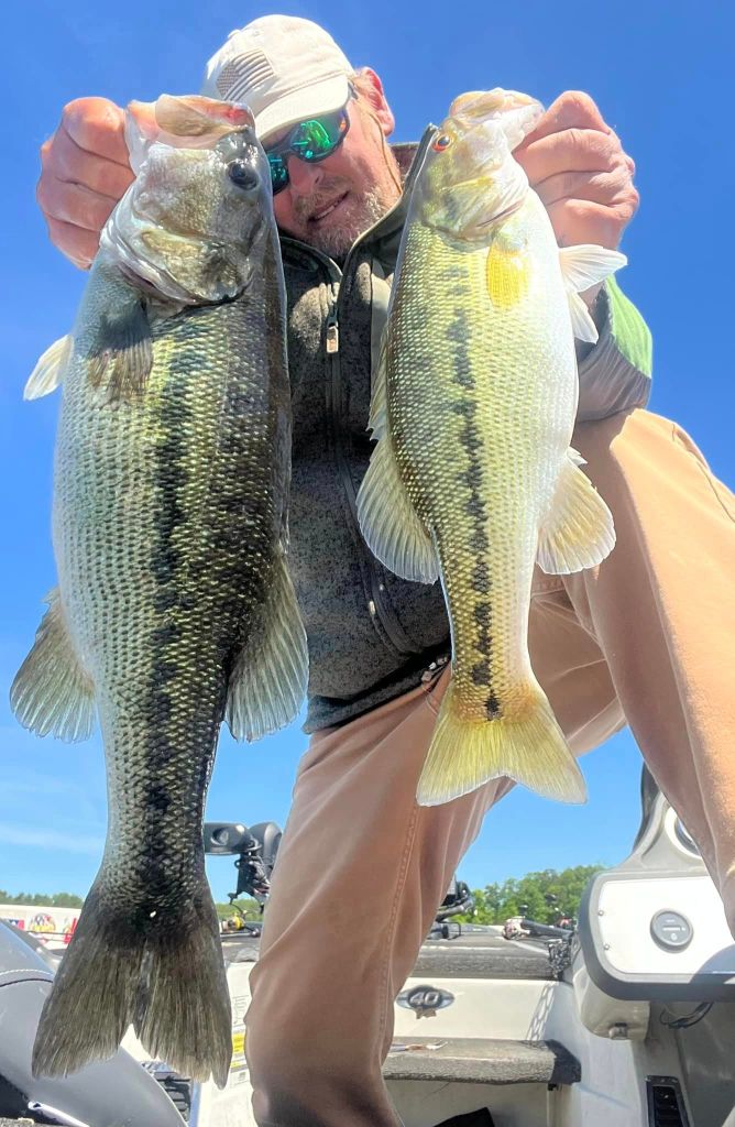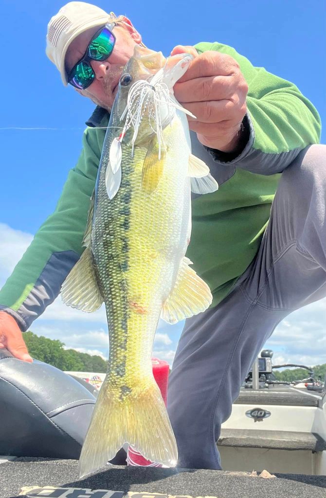 I only fished a total of 13 hours (mostly in the creek) this week and it didn’t really give me much time to find my rhythm but nonetheless I was still able to put something together. There are several different patterns going on right now at different locations on the lake and even at different locations in the water columns. Once again, it seems that the north end is ahead of the south in terms of fish feeding closer to the surface and changing their target food source to swimming baits due to the shad and blueback spawn. I believe there are still fish in spawning mode, hanging out close to structure on the shore, and I believe there are a lot of post spawn fish in transition to their summer homes out on the brush. This week I chose to target the post-spawn fish around the brush out in deeper water after seeing the bulk of the glitter boat fleet beating the shallow shores. Monday and Tuesday my back was recovering, and they were pretty much a wash for me, and on Wednesday I finally made it out for a while with my back brace on. We had a lot of NW wind to contend with on Wednesday. I got out early to avoid as much wind as I could, and I eventually went back to finesse after bombing for the first hour or so on the topwater and shallow moving stuff. With all the wind I decided to target the transitioning fish that were post spawn and hanging out around the brushpiles and relating to the bottom. I didn’t see a lot of suspended fish, so I just positioned the boat at a casting distance away from the brush, upwind, and spot locked the trolling motor to fan casting around the brushpiles. I usually tried to make a few casts with the spinnerbait over the top of the brush using a 5-10 count before throwing the shaky head. Sometimes there will be a sizable bass hoovering over the brush and the spinnerbait has been my go-to for getting that bass to react before throwing the worm and working on the deeper bottom-oriented fish. On Wednesday that’s pretty much all I did, move around and target the brushpiles in 15-25 feet of water and with the combo of the spinnerbait and then the shaky head. I missed some fish on Wednesday and wasted a lot of time on topwater but I found a few nice ones to end the morning using the shaky head and spinnerbait combo. Here’s a couple nice ones I caught hanging around the brushpiles.