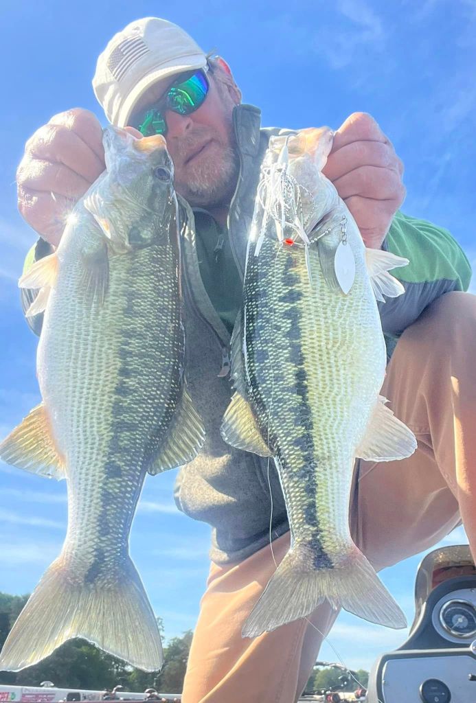 Thursday morning, I hit the water early as I wanted to target a few main lake points to start my day. I had my fluke rod rigged with the new Ham Bone color on a brand new leader and I was looking for big fish on top of brush early in the morning. This week it just seemed like the better bite was over brush in 20-25 feet of water, although most of the fish were beat up from the spawn, they were willing to eat and on the larger side. They were few and far between at times, but I was able to scratch out some good fish over brush in the creek after coming back from some main lake points. We had some wind on Thursday, so it was just a matter of me finding the brush piles in 20-25 feet of water with wind and chop blowing across the area. The wind and chop were the key as the fish were moving around the brush feeding in the wind and much more active than the fish in the calm or flat water around brush. Again, Spot-Locking up wind, fan casting the Ham Bone fluke down wind and bringing back over the brush with a few very quick snaps with my wrist, letting it fall and then snapping or popping it again accounted for all of the fish I caught on Thursday, and I had some good ones. By the time I had to head back home I was on my last Ham Bone fluke, and it was about to hit the graveyard when I caught my last fish to end the day and destroying my last Ham Bone bait from the bag. It was a fitting way to end the day and end my week out on the lake. It was a fun day in the creek and the population of fish out on the brush is growing by the day. The lake is dropping and almost a foot below full pool. Water temps are around the 70-degree mark and it’s continuing to warm. Here’s a few fish from Thursday and fishing over brush with the Ham Bone fluke.