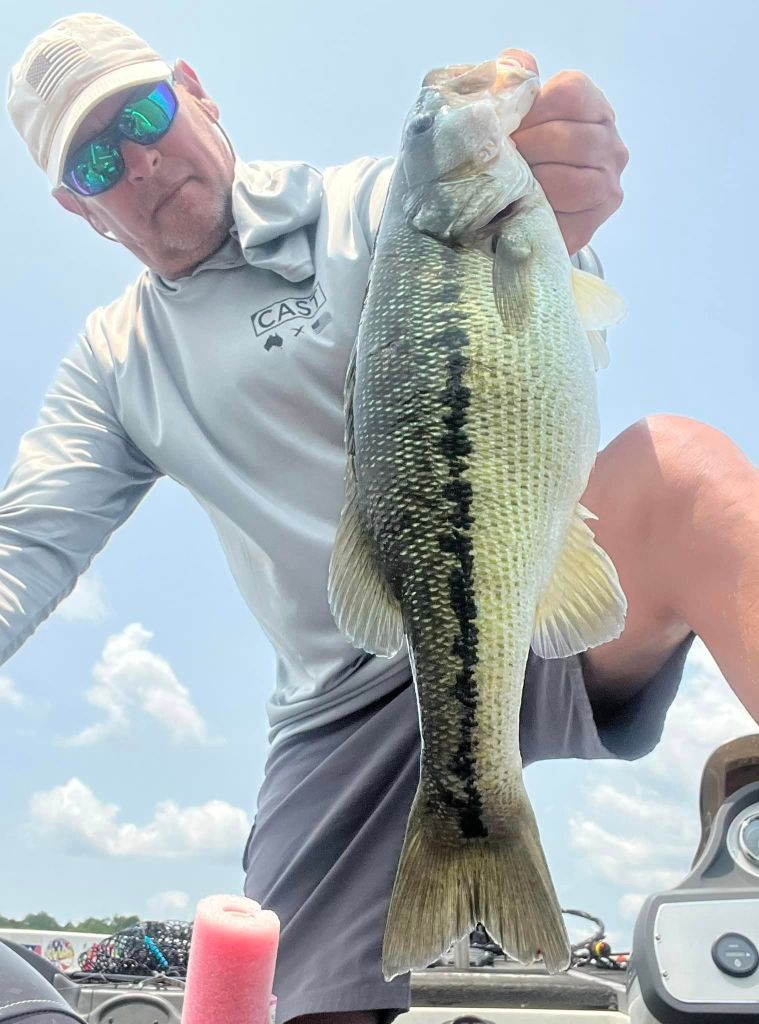 First being the “match the hatch” theory. Right now, we are early in the summer and a lot of the bait that is out there right now is small. I probably saw it at least half a dozen times today alone; the baits that the fish were chasing measured about1-2 inches in length. The little bait would be skipping across the water with a nice sized bass hot on its tail. Early in the morning and late in the evening the threadfin shad schools tend to come closer to the surface and right now the shad are still small. That big ole 4–5-inch topwater bait or swimbait I’m throwing looks nothing like the 1–2-inch threadfin shad that are scattering everywhere and being chased by the bass. Usually, it takes me a hot minute to figure it out but recently I’ve been combating the “match the hatch” problem with my little Duo Realis G-fix 80 spybait. Another suggestion would be a 1/8-1/4-ounce bucktail but I don’t tie or use them like I use to. I just run the spybait around the area the fish are coming up and usually it doesn’t take long to feel my little spinning rig load up. When a big fish hits the little spybait, the rod feels like the bait just hit a brick, then the brick pulls back. It’s a great feeling and a good early morning option when the bass are chasing threadfin shad early and late. Here’s a picture of my first two bass early Tuesday morning using the little G-fix spybait.