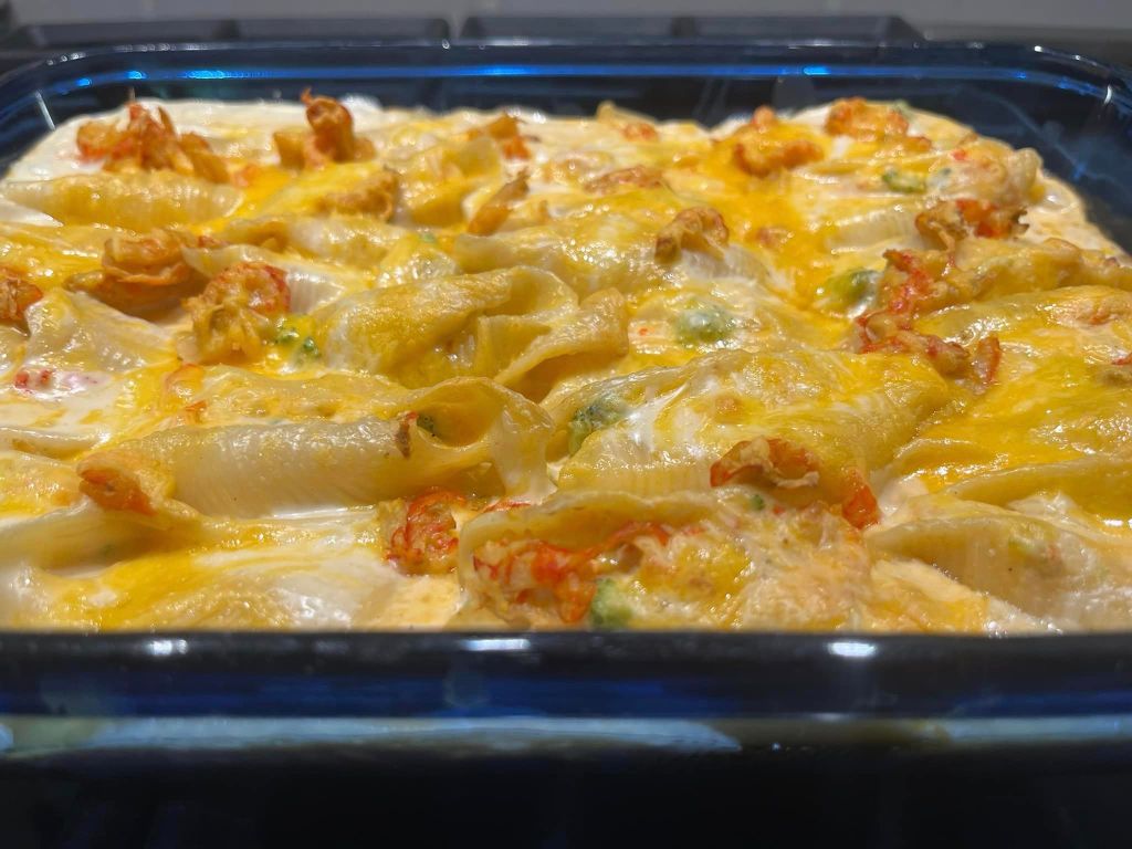 Once I’ve filled the pan with the stuffed shells, I top it off with the remaining alfredo sauce, the remaining crawfish tails and lightly cover with some grated cheddar cheese.