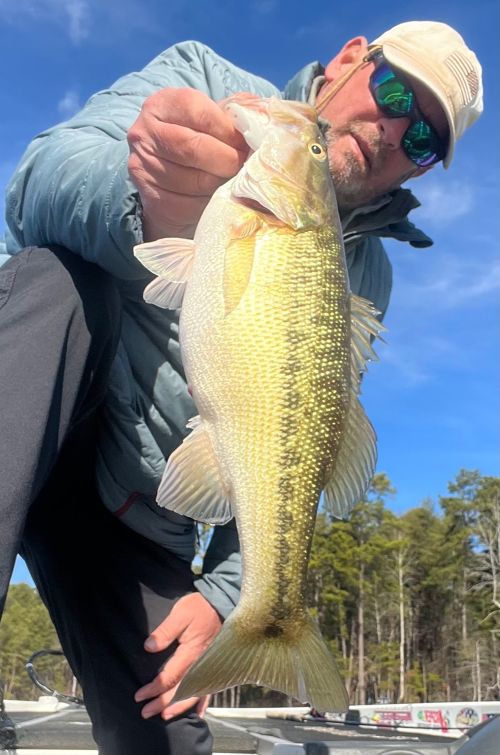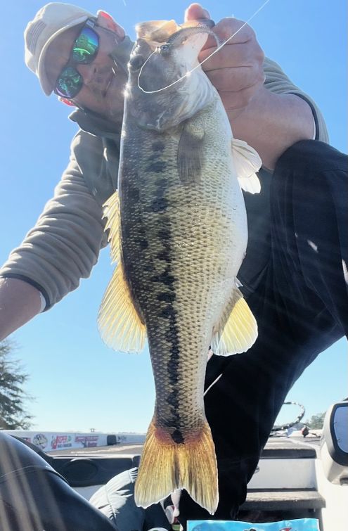 I started out on Monday in Jeff Nail’s boat after a 28-day layoff from the lake. The water was around 48 degrees, and we were hitting the ditches early on a cold morning. It didn’t take long for Jeff to boat the first fish in 40 feet of water with a little swimbait on a 3/8-ounce jig head from Spot Choker. He showed me the new Spot Choker head and I got a few from him to try. I also got a few of Trixster Baits Damiki heads and between the two different heads we were able to put 9-10 fish in the boat by days end, mostly on the swimbaits out in deeper water. I threw my favorite shaky head worm around when I thought the terrain looked like wormy stuff, but I came away with very little on the shaky head. For that reason, Jeff and I stuck with the little swimbaits for the majority of the day. The cool part was that I got a good look at forward facing sonar again and I’m going to have it very soon on a newer boat.