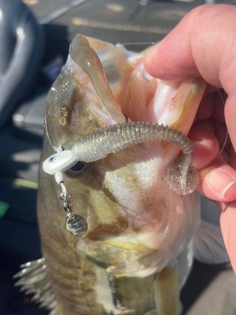 Here’s the difference between a 5lb fish and a 2.14-ounce fish, both on the 3/8-ounce Spot Choker head with a 2.8 Keitech. One caught early in the morning and one later in the day.