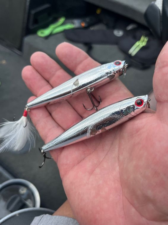 After the wind died down about mid-morning this week, there was usually a lull in the action but about early to mid-afternoon the breezes would pick back up and I could chase the chop again. One good thing about the afternoon bite and using chrome baits is the flash effect. In the afternoon sun the fish would react to the flash from the chrome a lot. By moving the bait in a side to side, walking the dog fashion the bait would flash in the sun. the flash would cause the fish to school and react to it. Sometimes the bait would just be floating stationary on the surface if I got distracted and out of nowhere a fish would just explode on the stationary bait. I also watched schools follow the chrome bait all the way back to the boat without reacting to it but definitely the flashing chrome was the key in the afternoons and evening. Finding the patches of chop and matching it with productive areas was the biggest key to my success this week and having the right bait for the task put my fish in the boat.