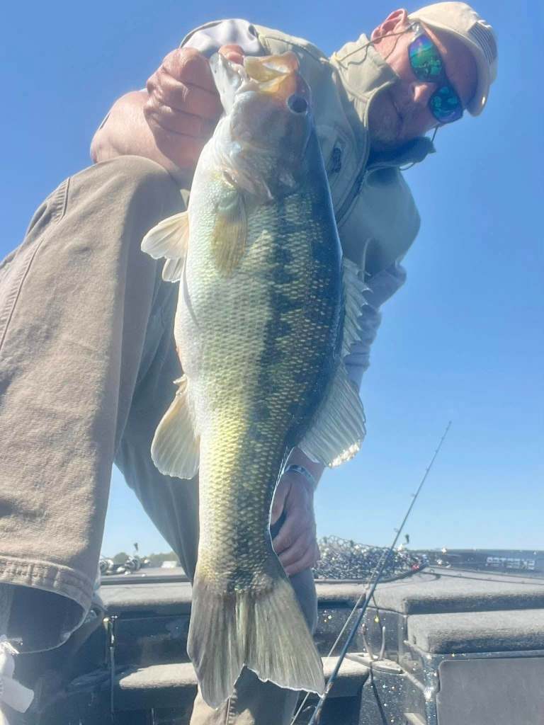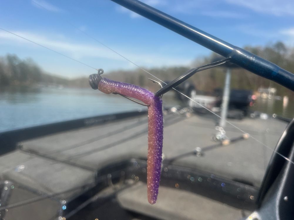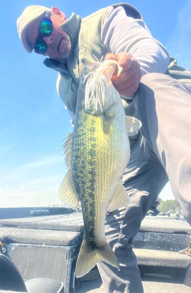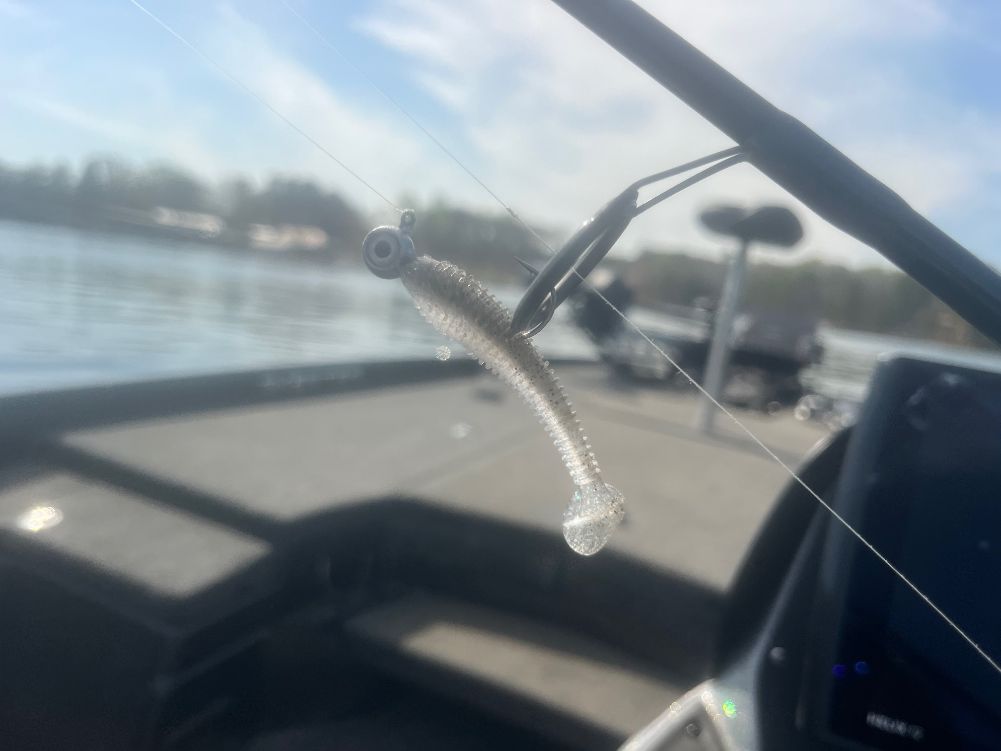 The last bait I used yesterday was the Zman Jackhammer chatterbait. Man, I gotta tell you guys, I love me some chatterbait in the spring. If nothing else, I love the way my rod unloads and reloads when they hit the chatterbait. The heck with Livescope! Give me the thrill of not knowing exactly when it’s going to happen and when it does happen, it can be extreme. Once I broke off that spinnerbait yesterday afternoon, I didn’t skip a beat and hit a rock point with wind on it. On my first cast I felt the chatterbait unload and reload, and I knew a fish had swirled on it. My very next cast produced another swirl so I knew there was interest. I worked my way down the side of the point and made casts across the point; on my 4th cast, I felt the bait totally unload and then reload, doubling over with a fighting fish on the end. That’s such a great feeling when fishing points out in the wind. Years ago when I first started using the Jackhammer, I mainly used it around docks and in the shallows in the spring but over the years I’ve broadened my usage of the chatterbait to include rocks, docks, points and random bank beating. Basically, I’ll use it anywhere, anytime the wind is blowing and it’s sunny out. One of the biggest attractions using the chatterbait is that chrome flash from the blade in the afternoon sun. That flash is a fish magnet and one of the main reasons I have success with it. Another successful area I like to use the chatterbait is the shade patches around docks in the afternoons. There’s just something about running that chatterbait through a shade patch down the side of a dock and feeling a fish slam it in the dark shadow. I finished my afternoon yesterday about 4pm and the last 2 hours were spent throwing the chatterbait in the wind and popping the occasional bass. I think the chatterbait provided the most fun for me yesterday and the wind was instrumental in my success. I used a pearl paddletail fluke jr. for a trailer on the chatterbait and it provided a great ending for my week.