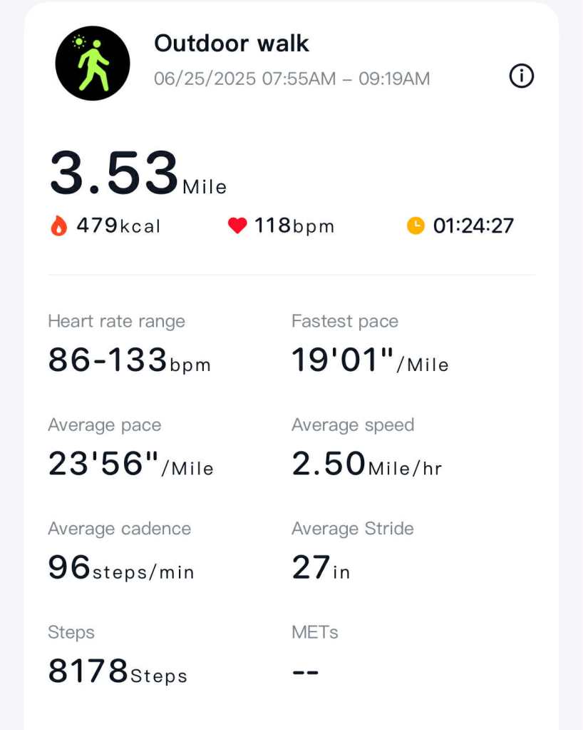This entry covers yesterday and today but I only timed todays walk. Also, the mileage on my watch and the data above doesn’t really match what’s marked on the trail, but the real mileage was about 4.2 miles total today. Yesterday was a three mile walk.
